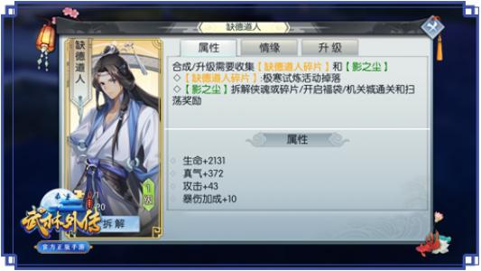 据说当今世上会隔空打穴的只有三人,而缺德道人便是其中一人。隔空打穴是葵花点穴手的进阶版,是一种极其厉害的隐秘武学。在极寒试炼副本中,有机会获得侠影碎片。他和莫太冲、凌腾云、平谷一点红、诸葛孔方一同上阵,还能激活情缘获得额外属性加成。