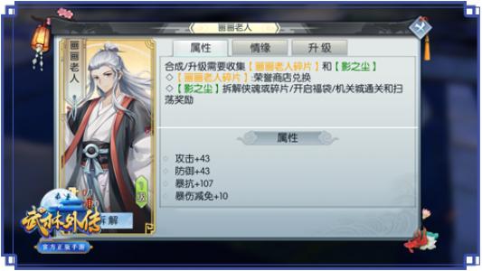 只需轻轻几笔,便可搅动江湖风云,画画老人是也。八岁时画出衡山剑法授予莫太冲,自此衡山派成立;后又画出葵花点穴手,使得神秘门派葵花派繁荣至今。他与江小道、断指轩辕、姬无力、佟伯达并肩上阵可获得情缘加成。客官需参加武状元、荒林竞技场累积荣誉值,以此兑换侠影碎片。
