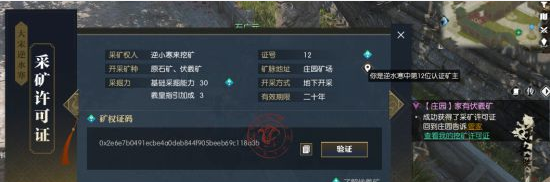 一番介绍后,矿业司签发了你的采矿许可证,需要你签字确认。签字成功后,即可获得一张采矿许可证,同时获得一个绑定的矿权编号(即区块链账号地址)。