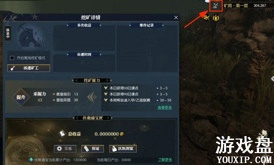 至此,伏羲通宝挖掘的引导流程已基本完成,后续可以通过打开界面右上角的按钮,打开挖矿详情界面进行挖矿和伏羲通宝管理,或者可以在矿洞中找矿业总管进行操作。