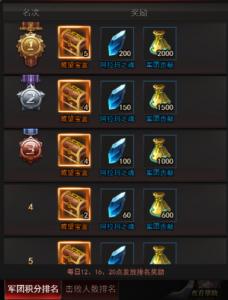 所有玩家每次进攻领地无论胜利或失败均可获得参与奖励,而积分排名前五名的军团,其军团所有成员都会获得排名奖励。军团排名奖励将会在每天的12、16、20点通过邮件发放,活动结束后将重置战场及排名信息。