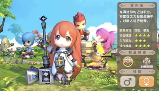 充满信仰的近战职业,将雷霆之力凝聚战锤中,对敌人进行制裁。重要属性有攻击、暴击。审判者的攻击和操作难度较大,生存能力弱。30级时可转职为守护者,使用锤和盾牌。