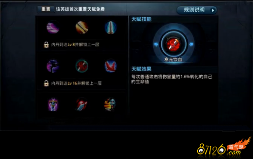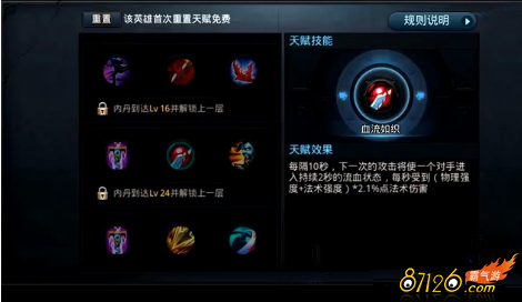 这个技能对于金角大王这样高攻高伤但是皮脆的角色是最不可缺的一项天赋了,每次普通攻击伤害就可以将敌方伤害的1.6%转化为自身的血量,是一项比价不错的天赋选择。