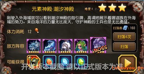 举例说明:潮汐神殿难度1,大鱼的减甲配合小鱼的减攻击,有冰龙的保护,有仙女龙的沉默。已是非常规英雄能够打到3星的了,所以大家除了竞技场硬性需求的英雄,尽量多存一点装备,到开放神器系统的时候可以把一些打这些副本英雄喂起来。尽量多存金币,英雄技能点到100级就好。
