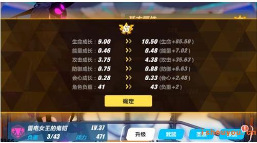 女武神的面板分为HP、SP、攻击、防御、会心及负重六项数值,均能通过升级和晋升提升,这里着重提一下负重。舰长可以把负重理解为对角色强度的一个限制,每名女武神的负重初始数值都比较低,而性能越好的武器、圣痕所需的负重也越高,因此在游戏前期没必要硬去凑齐一套高星级的圣痕,等负重数值提升后再研究配装也不迟。