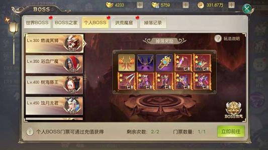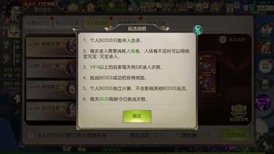 个人BOSS玩法是仙豆手游《灵剑劫》中BOSS系统的分支之一,玩家们可要自由选择等级挑战主要产出高阶装备、部分稀有材料及道具。另外,个人BOSS的进入需要达到一定的VIP等级,且需要消耗相应的入场券,入场券可以通过活动或者市场收购。